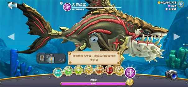 要想购买这只鲨鱼还有一个比较苛刻的条件就是拥有所有的xxl级的鲨鱼,也就是说玩家要购买姥鲨、鲸鲨和大白鲨后才能解锁这只巨齿鲨。解锁后玩家需要40万的金币或2000的钻石才能购买。