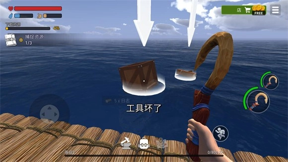 5、采集材料有两种方式,一种是靠手来采集,这种方式只能采集木筏周围的,另外一种是用木钩来采集周围漂流的资源。