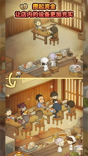 顾客吃了料理,他们的满意度会相应上升,满意度上升后还会引发对话。游戏中的金币主要用来购买店内设备,例如能够增加制作料理总上限的料理放置台,餐桌用来增加在店内吃饭顾客的人数上限,以及冷藏库、收银机等等提高各项属性的道具。在进入店内的每位食客都有着独特喜欢的料理,不断地吸引食客来吃饭从而增加每个食客的满足度。随着满足度的增加会触发不同食客的特殊对话剧情。