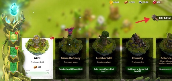 要使用它,在您的城市内,点击左侧的锤子图标,它会带您进入建筑菜单。在此页面上,您会在屏幕右侧看到另一个小锤子图标,称为城市编辑器。