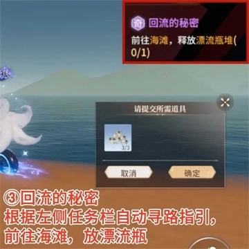 根据左侧任务栏自动寻路指引,前往海滩,放漂流瓶