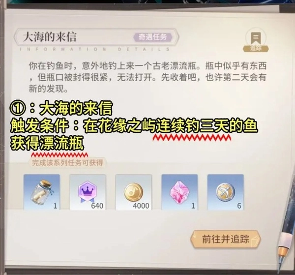 触发条件:在花缘之屿连续钓三天的鱼获得漂流瓶
