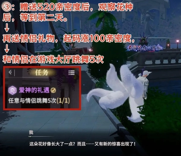 3. 赠送520亲密度,仔细观察花种,随后等待至第二天。接着赠送情侣礼物,这样至少能提升100亲密度,并且要和情侣在游戏大厅共舞5次。