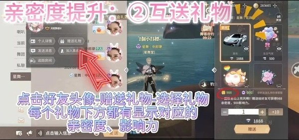 点击好友头像,赠送礼物。选择礼物,每个礼物下方都有显示对应的亲密度、影响力