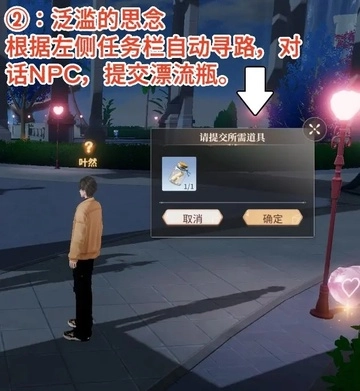 根据左侧任务栏自动寻路,对话NPC,提交漂流瓶。