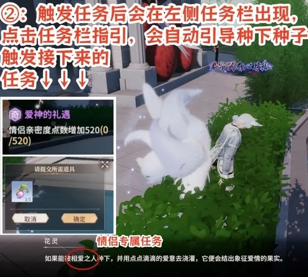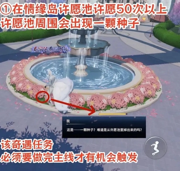 1.在情缘岛许愿池许愿50次以上许愿池周围会出现一颗种子