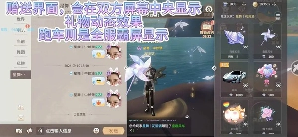 赠送界面会在双方屏幕中央显示,礼物动态效果,跑车则是全服霸屏显示