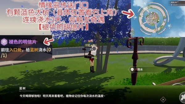 在情缘岛传送门的门口,有一棵蓝色的大树(具体位置可查看右上角)。若连续3天给这棵树浇水,就会触发奇遇【褪色的明信片】。