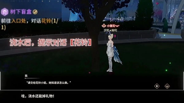 完成上一个奇遇任务后发现旁边粉树也能浇水(位置右上)连续浇水3天,触发奇遇树下盲盒