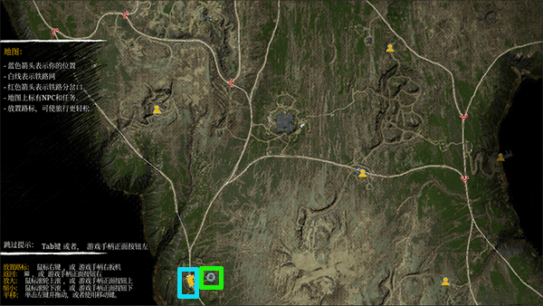 4、打开地图,发现这个小岛还挺大的,小屋在绿色方框内,我们现在所在位置在蓝色方框内;