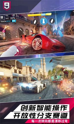 全新TOUCH DRIVE操作将帮你简化转向操作,让你专注于竞速的快感!但你也可以切换到手动控制(重力感应或点击转向),成为更专业的《狂野飙车》赛车手!