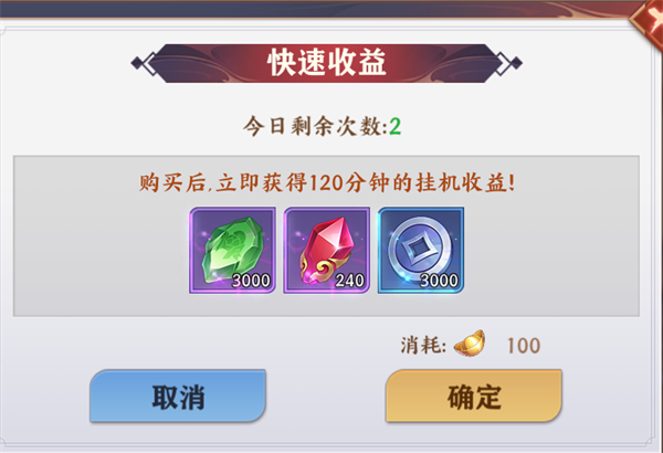 玩法额外内容:快速获利。玩家能够直接消耗元宝来获取120分钟的挂机资源奖励,每天仅有3次快速收益的机会。特别提醒:建议在每日完成养成,达到玩法的极限关卡之后,再使用快速收益功能,这样更有助于实现收益最大化。