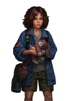 介绍:看上去10岁小女孩,聪明伶俐,是沙滩上破旧营地幸存者詹妮的女儿。