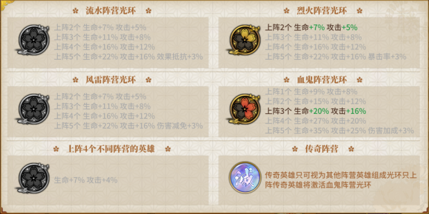 战斗队伍会依据上阵的阵营英雄数量,获取相应的阵营光环加成。血鬼阵营作为稀有英雄阵营,可得到更为丰厚的阵营光环加成。