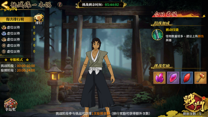 2. 在挑战阶段,每期的boss给予玩家5次挑战机会。系统会选取造成伤害最高的那一次挑战数据来进行排名。当挑战阶段结束后,会依据排名情况,以邮件形式发放奖励。而且每次挑战,玩家都能获取挑战奖励,不过挑战奖励的掉落存在一定随机性。值得注意的是,若在战斗中途退出,并不会消耗挑战次数。