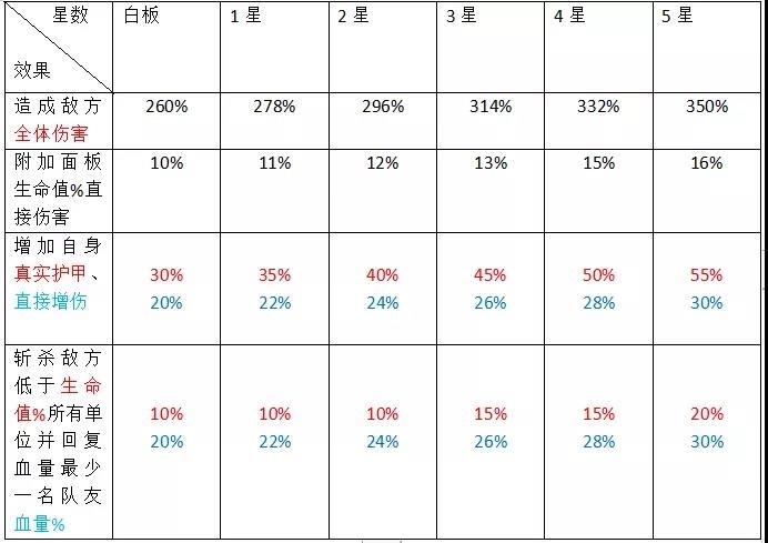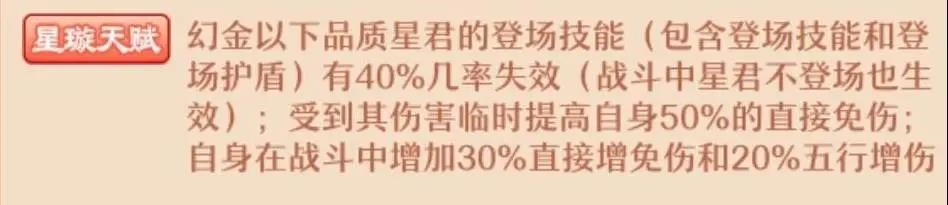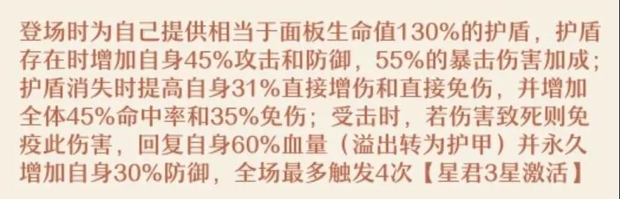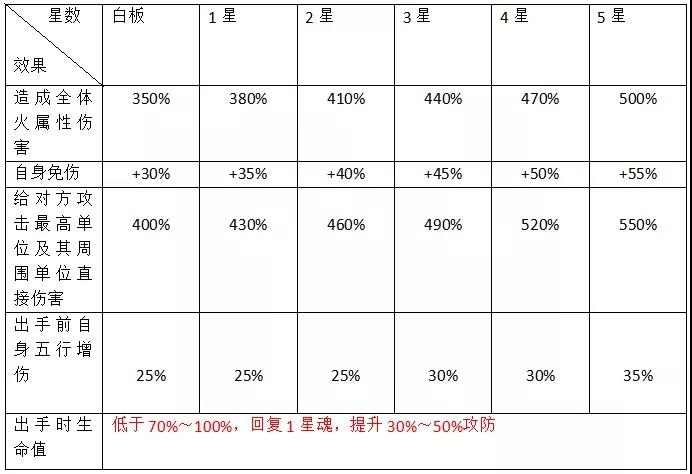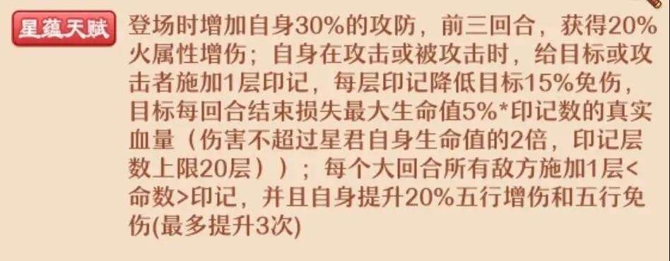 出手前增加自身五行增伤,若此时自身生命值低于一定比例值,则为自身增加1点星魂并且攻防提升(满星则百分百有此效果,相当不错),更容易残血反杀,逆风翻盘。