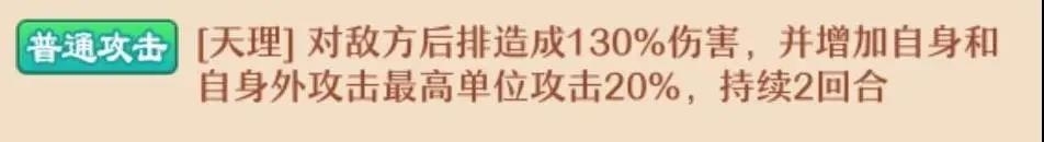 司命打后排,增加自身攻击20%,额外增加给我方攻击最高单位攻击,且持续2回合。比较常规的增强,主要是为了技能和法宝大招做铺垫。