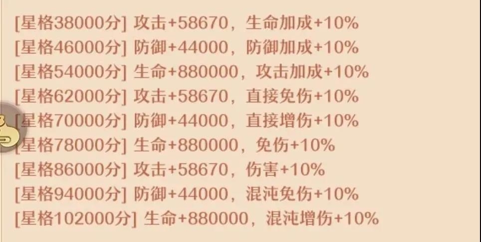上阵后根据不同星格分数增加相应属性,直接增加相对应神将攻、防、生命,直接增伤、免伤,混沌伤害、免伤,增加效果相当可观,进一步增加神将输出及生存能力。
