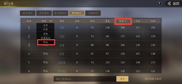 1、首先是在野地里的将领,这是前期最容易抓的将领。首先我们可以点开排行榜选择将领排行,筛选出在野地里的将领,然后将属性降序排列,选择高属性的将领。