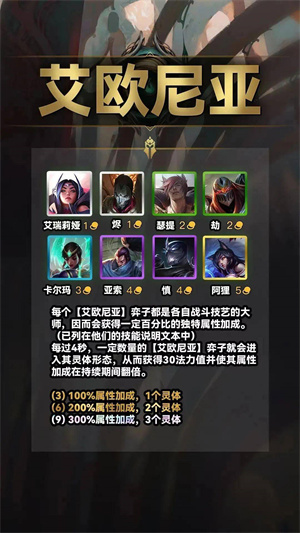 每4秒,你最大的1/2/3个艾欧尼亚英雄会获得20法力值,并且艾欧尼亚加成翻倍。