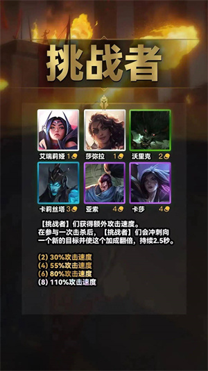 征服者可获取30%/55%/80%/110%的额外攻击速度。一旦其攻击目标阵亡,挑战者便会朝着新目标冲刺,同时将该额外攻速提升50%,此效果持续2.5秒。