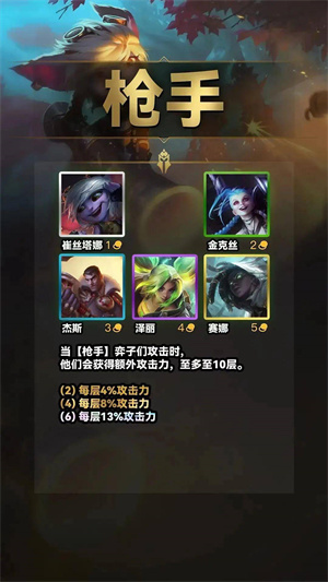 枪手攻击时会获得5/10/16%额外攻击力,最多可叠加8层。