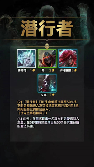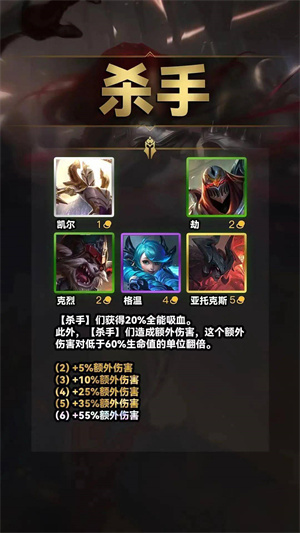 杀手获得15%全能吸血。杀手造成5/10/25/35/50%额外伤害,并且对抗低于60%生命值的敌人时该额外伤害效果翻倍。