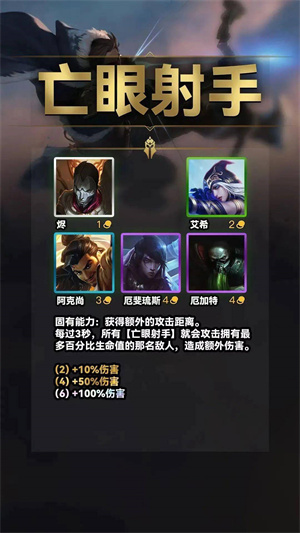 每3秒,神射手会攻击一次生命值百分比最高的敌人,造成20/45/100%额外伤害。