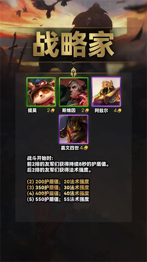 战斗开始时,前2排的友军获得200/350/400/550护盾,持续8秒。后2排的友军获得20/30/40/55法术强度。