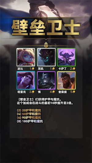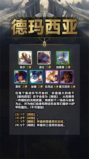 在每个回合,你最为强大的1/2/3/5名德玛西亚英雄,会各自获取一件随机光明装备。同时,这些英雄还能为邻近的友军提供5/25/80/200点双抗加成,不过该双抗加成不会叠加。