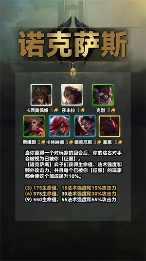 诺克萨斯英雄可获取160/280/420的额外生命值、16/28/42的法术强度以及16/28/42%的攻击力。当你战胜来自不同区域的对手时,该效果会提升10%,最高提升幅度为70%。