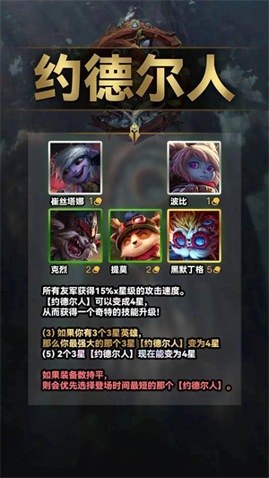 如果你有3个3星英雄,你的最强大的1/2个3星约德尔英雄会变成4星,强化他们的技能。