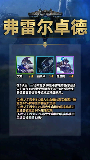5秒后,一场冰风暴席卷棋盘。敌方英雄会受到5/12/20%最大生命值的真实伤害并获得负面效果。
