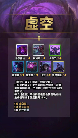 放置一枚虚空蛋。在战斗开始时,它会孵化为不可言说的恐怖生物并击飞邻近的敌人。每个虚空英雄星级会提升恐怖生物25%生命值和法术强度。