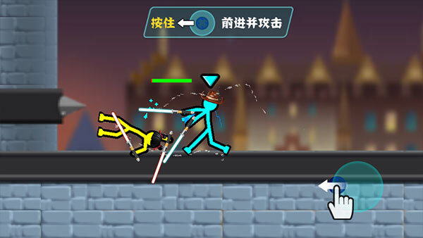 1、玩家在游戏中操控一个火柴人,利用简单的横版摇杆操作操控火柴人进行热血格斗。
