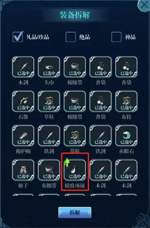 前期拆解默认凡品/珍品一键处理就好,后期紫装溢出再选择绝品。清理前记得提前把带箭头“↑”的装备换上,否则会一起被删掉。