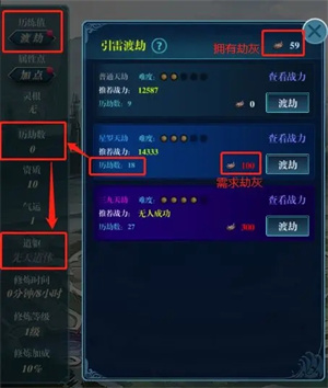 渡劫战斗的难度越高,所需劫灰的数量就越多(劫灰可在日常战斗过程中获取),与此同时,成功渡劫后所获得的历劫数也会越多。每次渡劫成功,历劫数便会在左侧属性栏中进行累积,当历劫数达到特定数值时,就能对道躯进行提升。而每次道躯升级,都能够提升一个修行灵根,进而提高相应修行功法所造成的伤害。