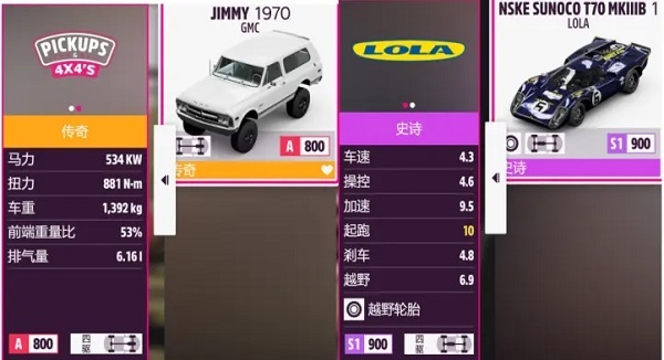 公路操控车GMC jimmy(左),拉力强车lola T70(右)其现实用途和在本游戏中有很大差距