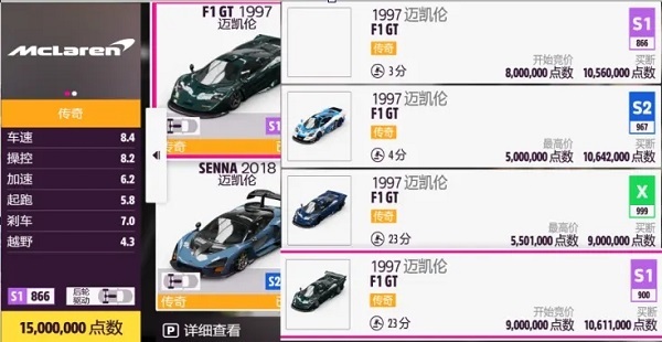 有些于车展上标价极高的车辆,实际上在拍卖行的价格会相对低出许多。当购置价格较高的车型时,不妨参考拍卖行的价格。就像线上与劲敌常见的迈凯伦F1 GT,在车展上价格高昂,然而在拍卖行购买却能节省不少资金。拍卖行里一些买断价高达2000万的车辆,大家平日里多留意季节赛播放列表以及马拉松商店,就能省下不少Cr,甚至无需花费Cr 。
