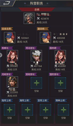 加入阵营之后,该赛季无法再进行修改,每个阵营均有若干官职,阵营首领为开服首日战功排名第一的玩家,阵营首领可以任命各个职位的成员。