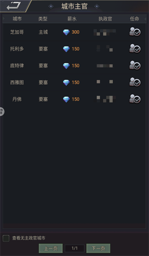 阵营在世界占领城池后,阵营首领可以任命该城市的主政官,每个城池只能任命一个该官职每天可获得一次资源奖励。
