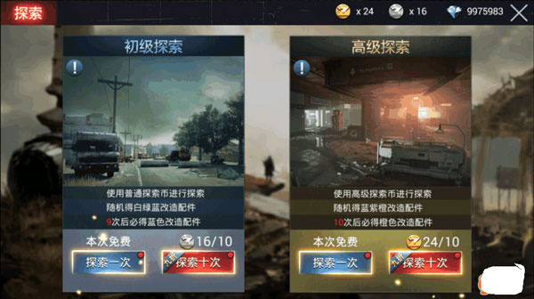 配件探索是《末日围城》中一次性花费钻石较多的地方,高级探索每十次探索必定获得橙色级别奖励,总之越是大手笔付出,获得的回报也就越丰厚!