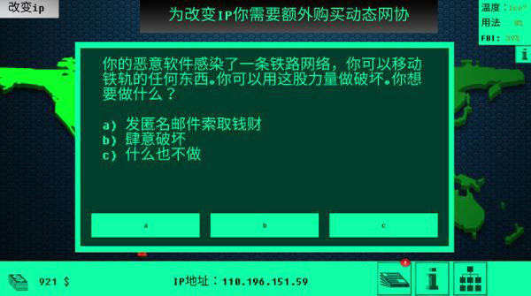 3、左上角可以花费金币更换自己当前的ip地址,防止被检查机构查到,右下角分别是新闻、信息以及升级页面。
