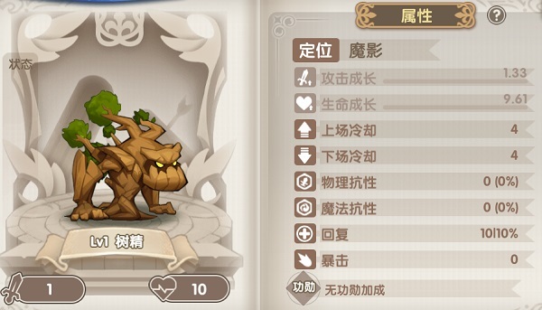 树精在精灵阵营中担当坦克角色,其生命成长数值较高,然而攻击成长表现较为普通。每个回合,树精能够对我方血量最少的英雄,造成等同于树精自身最大生命值的伤害。因此在战斗前期,当树精尚未充分成长时,它的骚扰能力相对薄弱;到了后期,则要留意输出位的血量是否处于最低水平,以防输出位承受过量伤害。