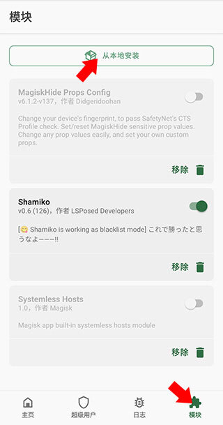 1. 第一步,我们要安装Shamiko模块,先下载Shamiko模块压缩包。接着打开Magisk,点击下方的“模块”界面,再点击上方的“从本地安装”,找到Shamiko完成安装(安装结束后需重启手机)。