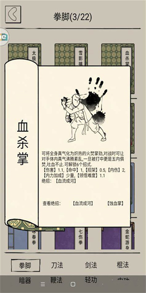 2、第二种选择为拳法,即血杀掌。血杀掌有两大绝招,其一为血流成河,此招不仅能造成伤害,还可附加流血buff,并且在攻击已处于流血状态的敌人时,能刷新流血的持续时间。其二是蚀血掌,命中目标后可造成伤害,同时带来负面的血毒buff。总体而言,血杀掌的伤害相较于血影要低。