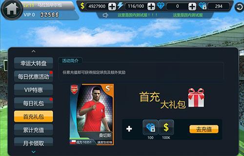 首先,我们在进入游戏之后可以快速获得一个S-级的速度型前锋,并且加上100绑钻和100K金币,这些只需要充值任意金额即可领取。