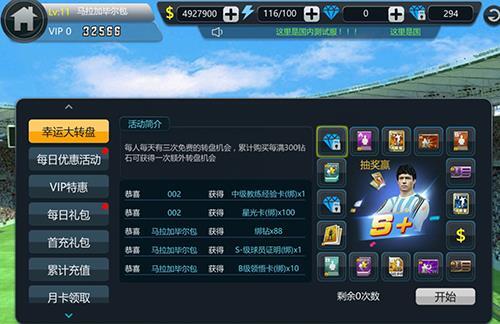 幸运大转盘惊喜开启!每人每天都能享有三次免费转盘机会,要是累计购买钻石每满300,还能额外再得一次转盘机会,中奖率高达100%!奖品丰富,金币、招募卡、绑钻应有尽有,更有机会直接抽到S+顶级球星马拉多纳!这可是一转成名的绝佳机遇,千万别错过!