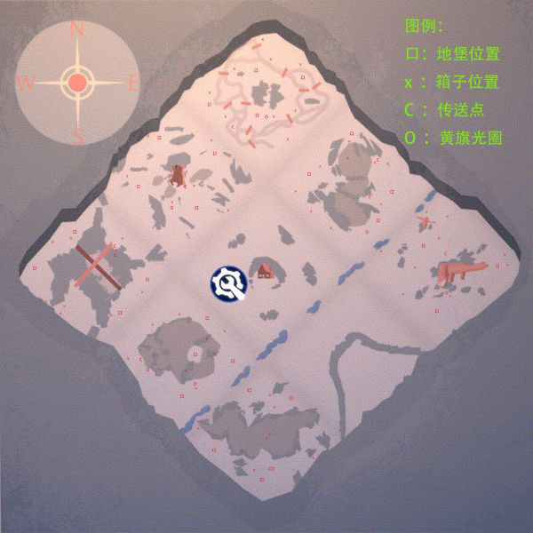 在这6张图里,这张图算是最“穷”的一张了。整个地图周边仅有5处存在地形,WN、NE以及S这三个区域都仅有一个地堡,而且没有任何箱子。值得注意的是,在WN和NE的炸桥点附近还分别有三狼(WN是三只白狼,NE是三只黑狼)。打野挖宝的时候,要是稍微不小心,就很容易白白送掉机会。