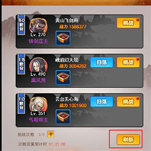 积分分为30、15、10;15和10积分可以扫荡,但是30积分只能挑战,默认是强力选手,我们可以点击刷新挑选战力低的选手进行挑战,三个奖励箱子10次挑战妥妥获得。